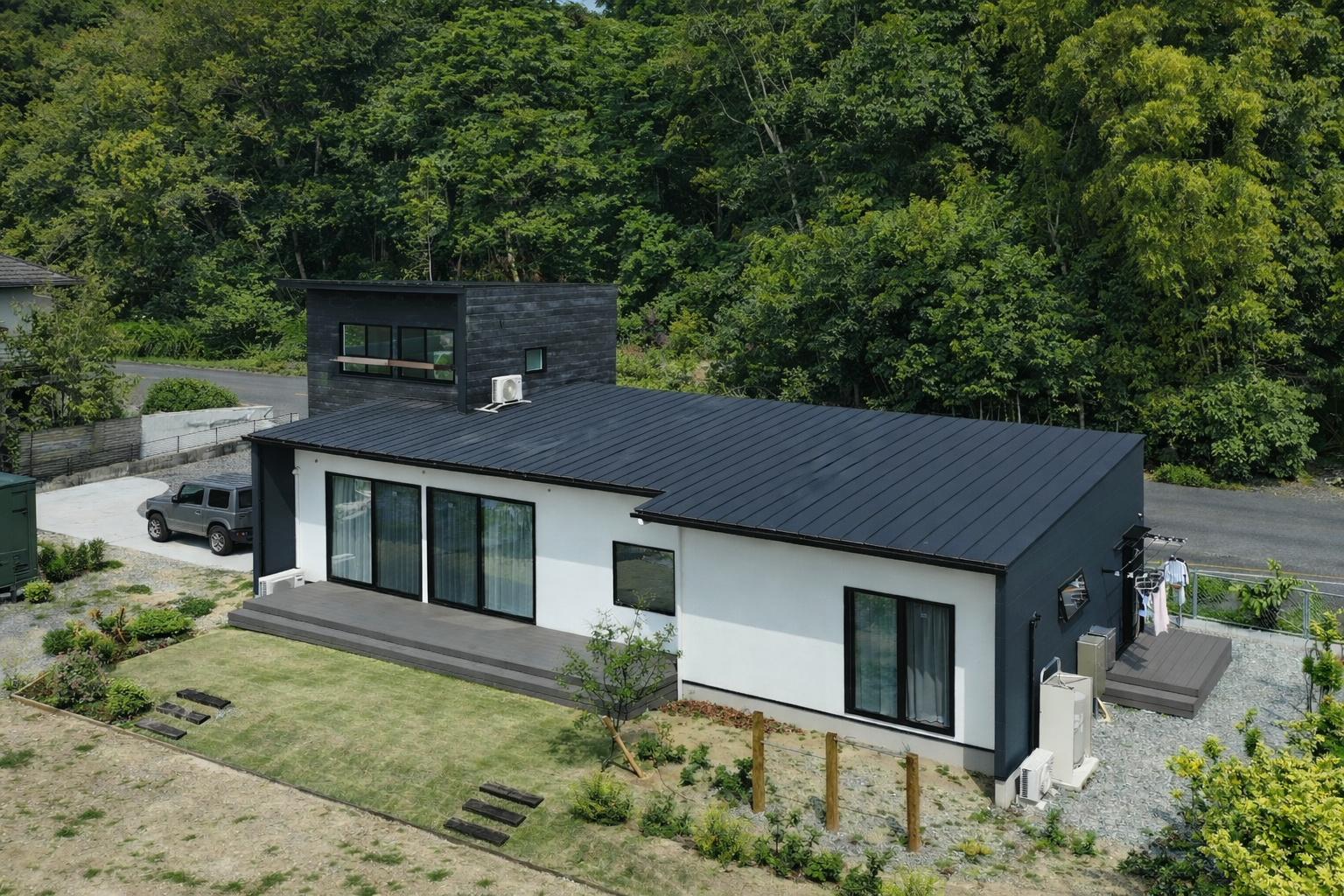 ご主人の趣味であるバイク用コンテナ設置も想定した真っ黒でスクエアな外観の男性的なお家。