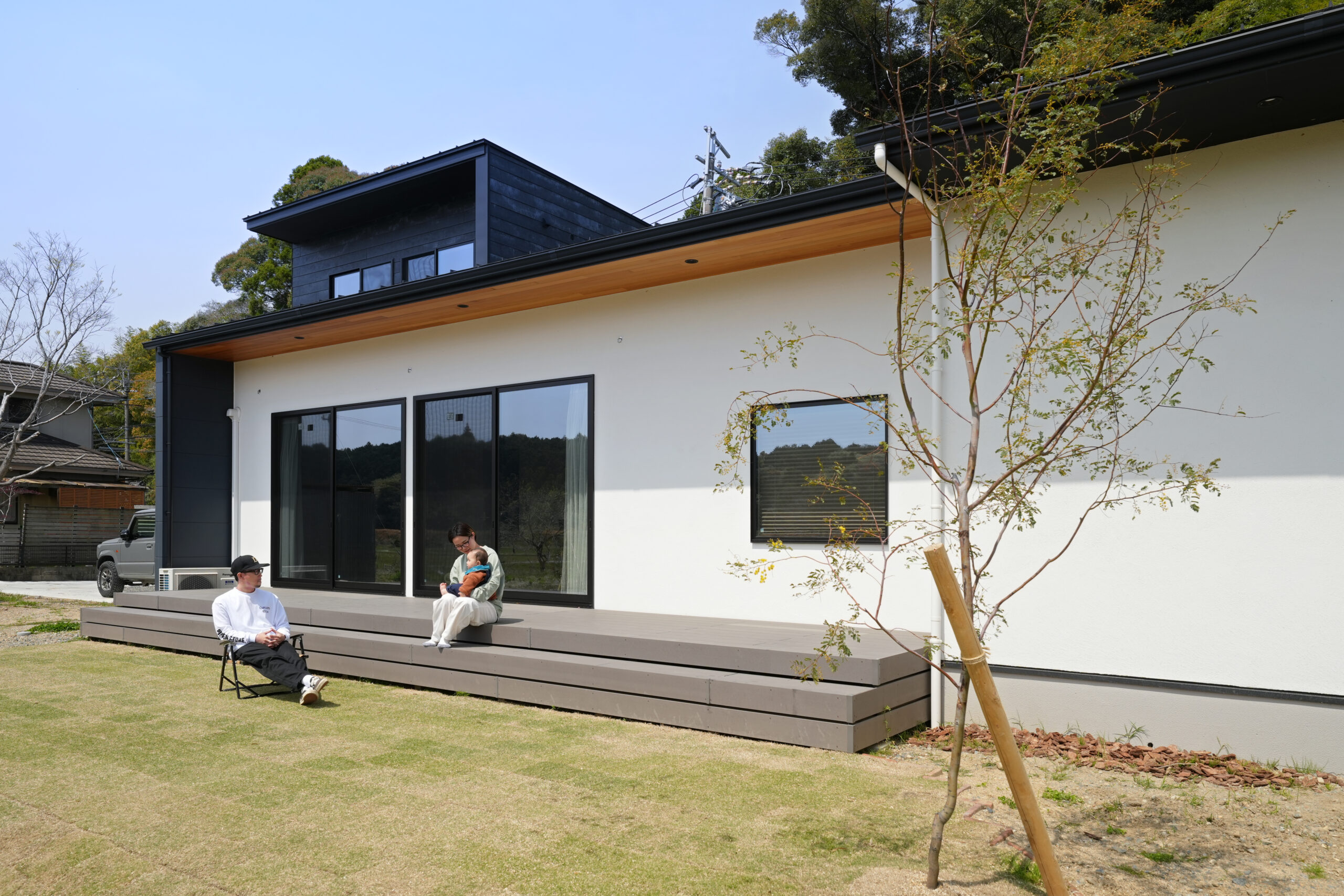 大開口の窓の先には庭が広がり、室内と屋外がゆるやかにつながる設計。横長の建物形状でありながら、視線の抜けを意識することで広がりを感じられる、平屋のように暮らせる家です。